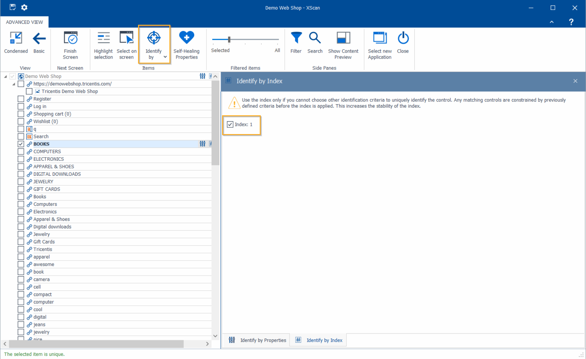 Um das Fenster Identify by Index in der Advanced View des Tosca XScan zu öffnen, klicken Sie auf die Schaltfläche Identify by und wählen Sie Index aus dem Aufklappmenü.