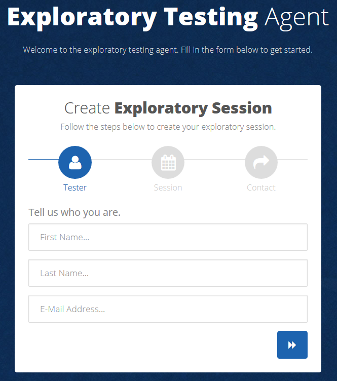 Als explorativer Tester können Sie mit dem Explorativen Testagenten explorative Sessions erstellen. Das Erstellen einer Session erfolgtin Ihrem Browser über eine Landing-Page, als Exploratory Testing Server Webseite bezeichnet.