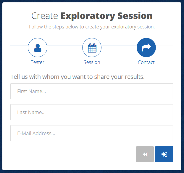 Geben Sie den Vor- und Nachnamen sowie die E-Mail-Adresse der Kontaktperson an, die benachrichtigt werden soll, wenn Sie Ihre Session beendet haben. Die Kontaktperson wird als Inhaber der Session festgelegt. Der Session-Inhaber erhält bei Abschluss der Session eine Benachrichtigung und kann daraufhin die Testergebnisse der Session in den Tosca Commander importieren.