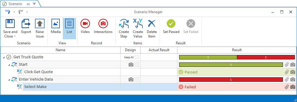im Menüband Szenario, um das Ergebnis auf Passed oder Failed zu setzen.Alternativ können Sie die Ergebnisse auswählen, indem Sie in der Seitenleiste der Ansicht Media oder in der Spalte Result der Ansicht List auf die entsprechenden Symbole neben den Testschritten bzw. Testschrittwerten klicken.