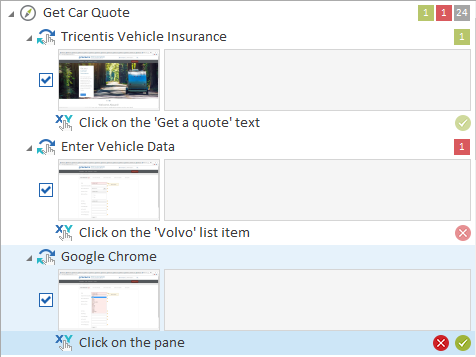 Im Szenario-Manager können Sie Testschritte und Testschrittwerte als Passed (OK) oder Failed (Fehlgeschlagen) kennzeichnen. Wenn ein Testschritt mindestens einen Testschrittwert enthält, müssen Sie das Ergebnis auf der Ebene des Testschrittwerts eintragen.
