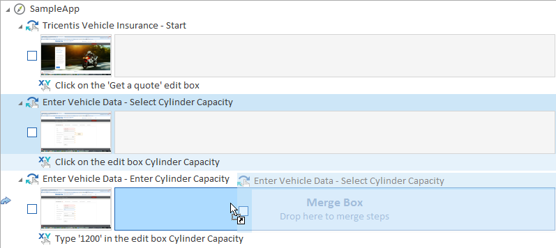 Ziehen Sie den Testschritt mittels Drag & Drop auf das Feld Merge Box des Testschritts, mit dem Sie den Testschritt zusammenführen möchten.
