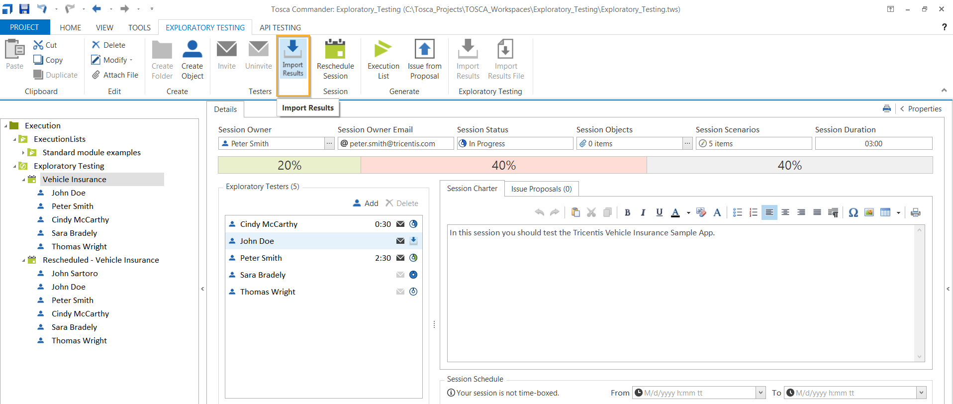 Sie können die Testresultate eines explorativen Testers vom Exploratory Testing Server in den Tosca Commander importieren, wenn der Test-Status des Testers auf Ergebnisse vorhanden gesetzt ist (siehe Kapitel "Session-Details").