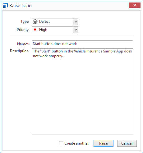 Es wird ein neuer Vorgangsvorschlag Issue Proposal mit dem standardmäßigen Wertetyp Defect und der Priorität Medium erstellt.