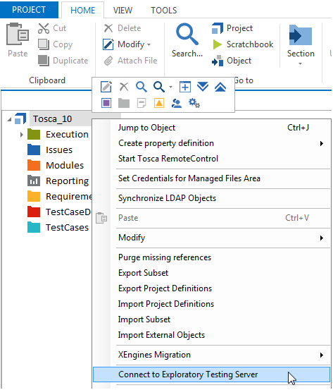 Klicken Sie mit der rechten Maustaste auf das Projektwurzelelement, und wählen Sie im Kontextmenü die Option Verbindung zum Exploratory Testing Server herstellen.
