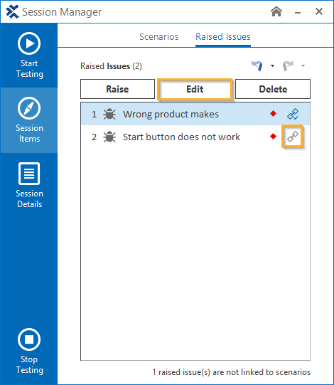 Wechseln Sie zum Reiter Raised Issues im Abschnitt Session Items des Session Manager, und klicken Sie auf die Schaltfläche Edit.