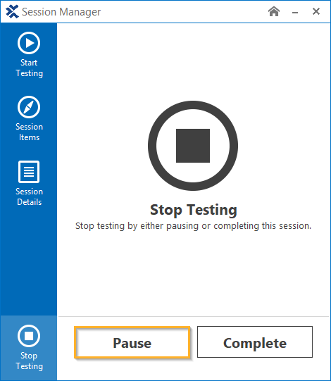 Um Ihren explorativen Test zu pausieren und den Session Manager zu schließen, klicken Sie im Session Manager im Abschnitt Stoppe Test auf Pausieren. Alternativ können Sie einfach das Session Manager-Fenster schließen. Der explorative Test wird pausiert und Sie können die Session zu einem späteren Zeitpunkt fortsetzen und beenden.
