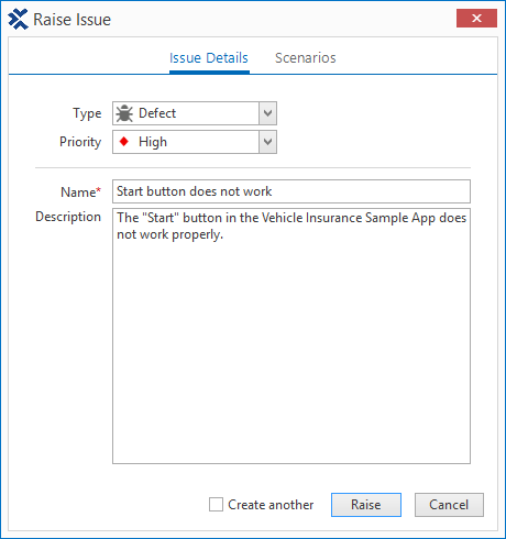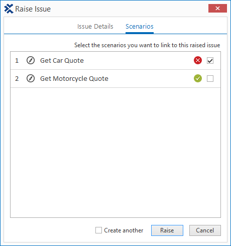 Optional können Sie im Reiter Scenarios im Dialog Raise Issue die Szenarien wählen, die Sie mit dem erstellten Vorschlag verknüpfen möchten.