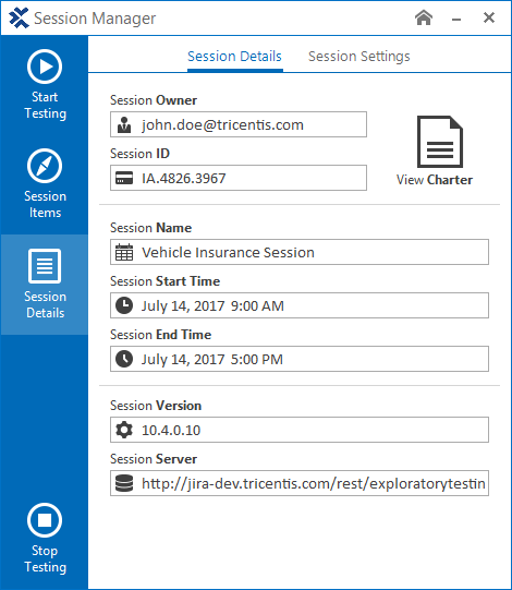Durch Klick auf die Schaltfläche Zeige Charter können Sie die Session-Charter, die Tester-Charter und die Session-Details anzeigen. In der Session-Charter sind Empfehlungen und Anweisungen für die explorativen Tester in Bezug auf die Testziele definiert.