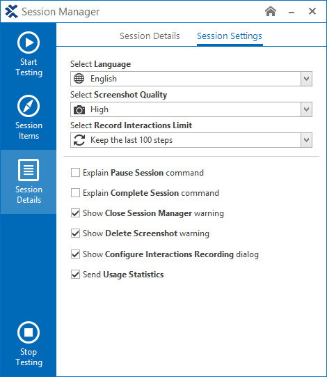 Sprache des Session Managers angeben Wenn Sie die Sprache auf Auto setzen, wird der Explorative Testagent in der Sprache gestartet, die auf der Landing-Page eingestellt ist.