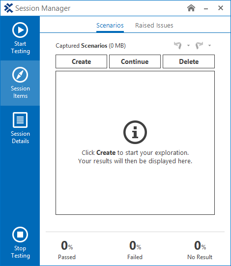 Ihre explorativen Tests verwalten Sie im Session Manager. Der Session Manager ist Teil des Explorativen Testagenten. Er führt Sie durch die Ausführung Ihrer explorativen Tests auf Ihrem Rechner und die Verwaltung Ihrer erfassten Szenarien und handhabt das Hochladen der Testergebnisse auf den Exploratory Testing Server.