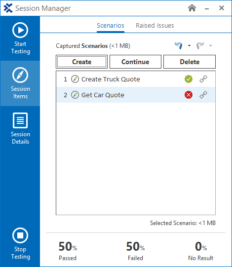 Im Session Manager können Sie entweder neue Szenarien erstellen, aufgezeichnete Szenarien fortsetzen oder vorhandene Szenarien löschen (siehe "Szenario erstellen, fortsetzen oder löschen").