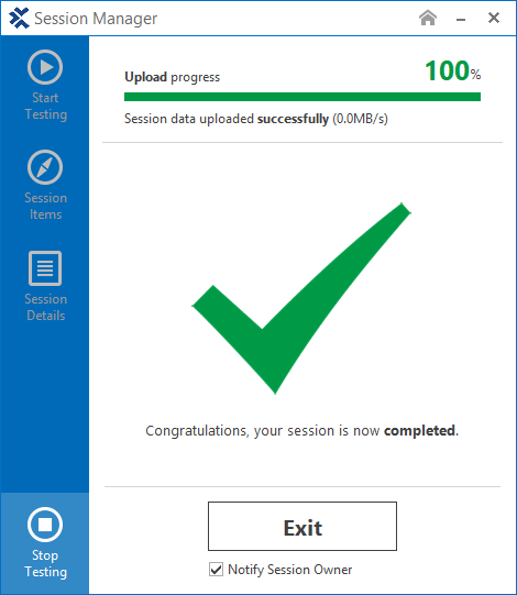 Im Bereich Stoppe Test in der Hauptansicht des Session Managers können Sie Ihren explorativen Test beenden und Ihre Testergebnisse hochladen.