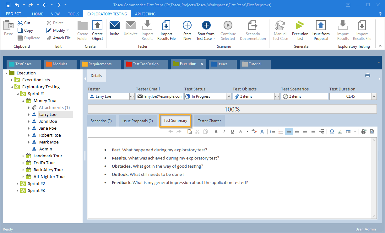 Im Abschnitt Zusammenfassung eines Testers können Sie die wichtigsten Fakten Ihrer explorativen Tests für die Verwendung in der Nachbesprechung mit dem Session-Inhaber zusammenfassen. In der Zusammenfassung müssen Sie Informationen darüber angeben, was beim Testen passiert ist, was erreicht wurde, was beim Testen gestört hat, und was noch ausgeführt werden muss.