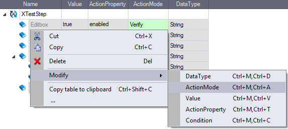 Der Wert in der Spalte Aktion kann für einen oder mehrere Testschrittwerte über das Kontextmenü oder das dynamische Menü Testfälle modifiziert werden. Diese Option steht für bereits ausgeprägte XTestschrittwerte zur Verfügung.
