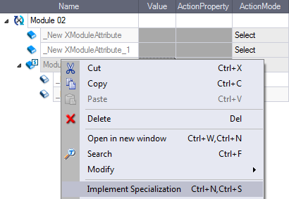 Wählen Sie über das Kontextmenü eines Modulattributs, welches mehrere Spezialisierungen besitzt, die Option Implementiere Spezialisierung.