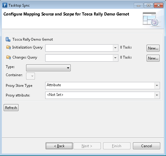 Wählen Sie über die Felder Initialization Query und Changes Query eine Query aus, die auf einen virtuellen Ordner in Tosca verweist oder erstellen Sie eine neue Query über die Schaltfläche New... (siehe Kapitel "Eigenschaften für die Synchronisation in Tosca definieren").