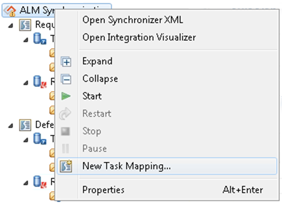 Selektieren Sie im Fenster Services das Wurzelelement ALM Synchronisation und wählen Sie über das Kontextmenü die Option New Task Mapping....
