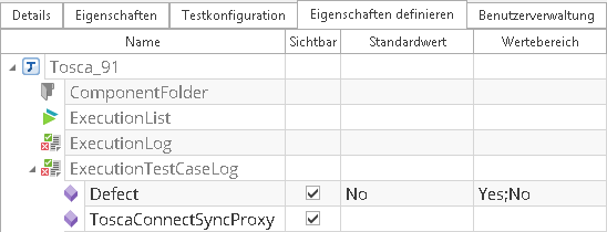 Defect: Diese Eigenschaft kann verwendet werden, um die Ausführungseinträge zu kennzeichnen, für die ein Defect erstellt werden soll. Alle Ausführungseinträge, die mit dieser Eigenschaft gekennzeichnet sind, werden bei der Synchronisation berücksichtigt. Die Verwendung dieser Eigenschaft, muss in Tosca Connect konfiguriert sein.