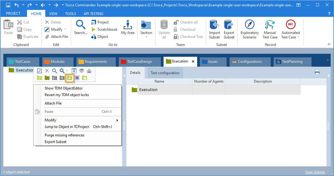 Gehen Sie zum Reiter Execution des Tosca Commander.