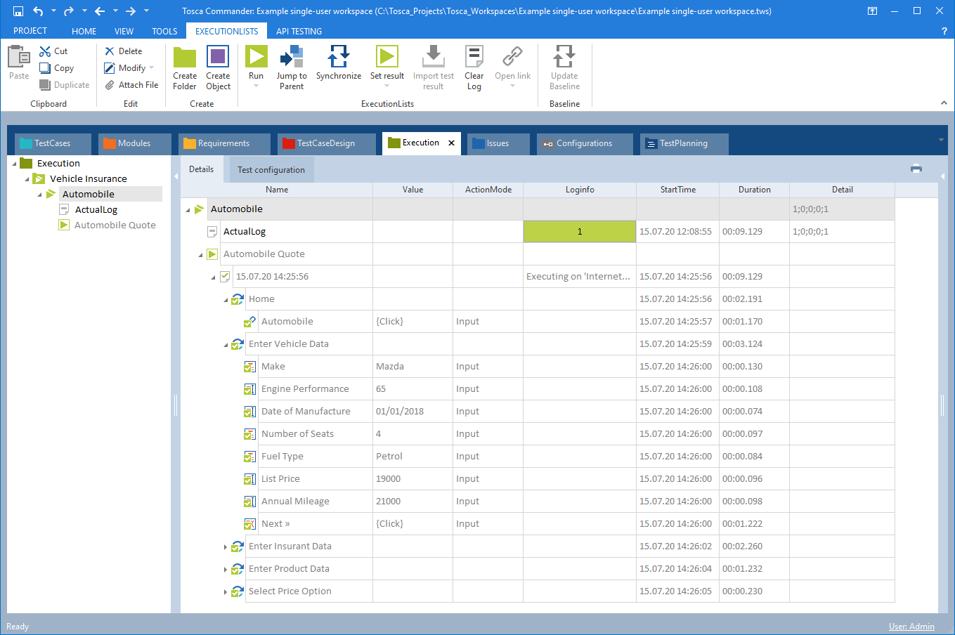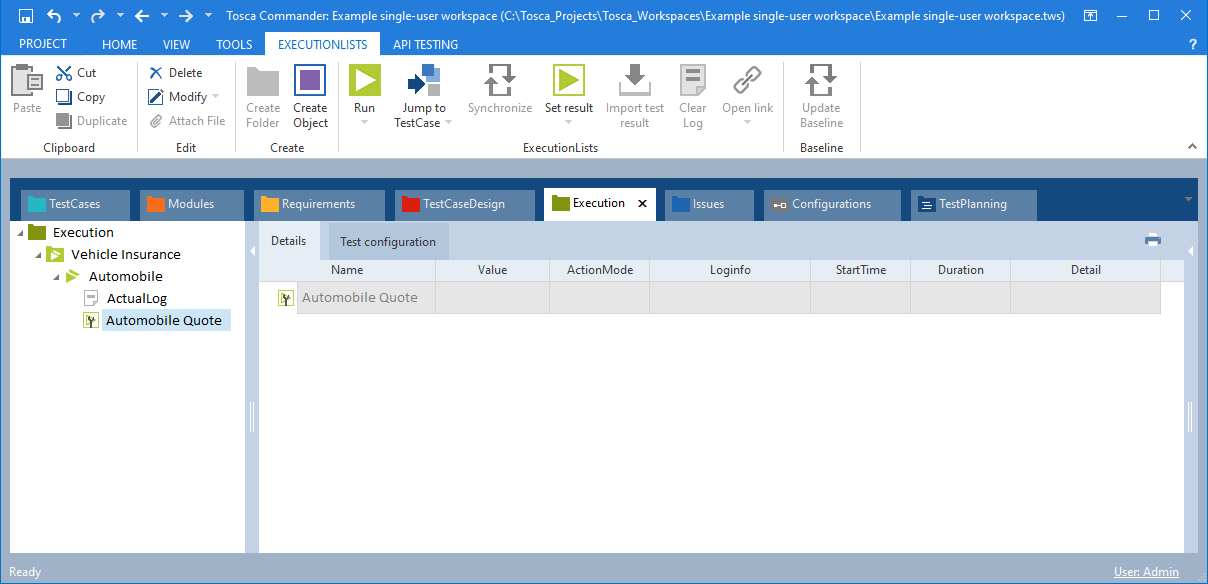 Ziehen Sie den Testfall Automobile Quote per Drag & Drop auf den Reiter Execution, bis der Reiter Execution aktiv ist.