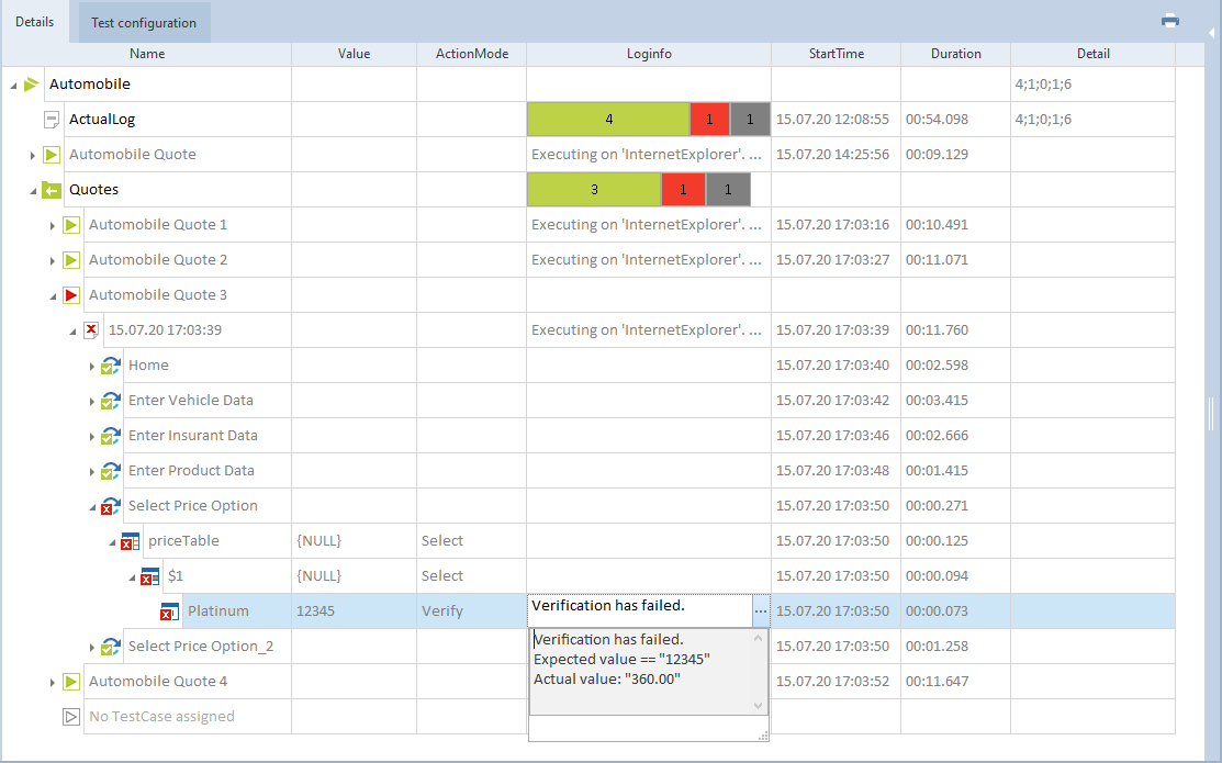 Zum Vergleich: Dies ist das Ergebnis des Testlaufs, wenn Sie die Demo-Applikation nicht öffnen. In der Spalte Loginfo wird der Grund angezeigt, warum der Testlauf fehlgeschlagen ist.