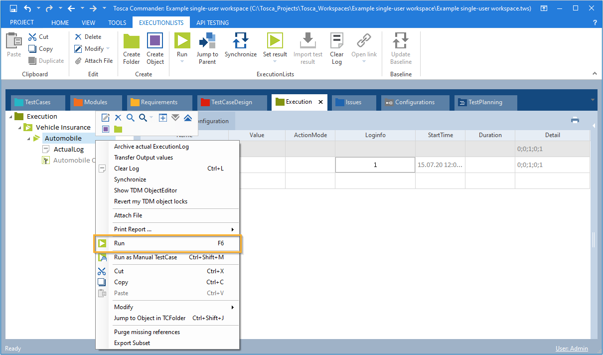 Tricentis Tosca erstellt einen neuen Ausführungseintrag aus dem Testfall.