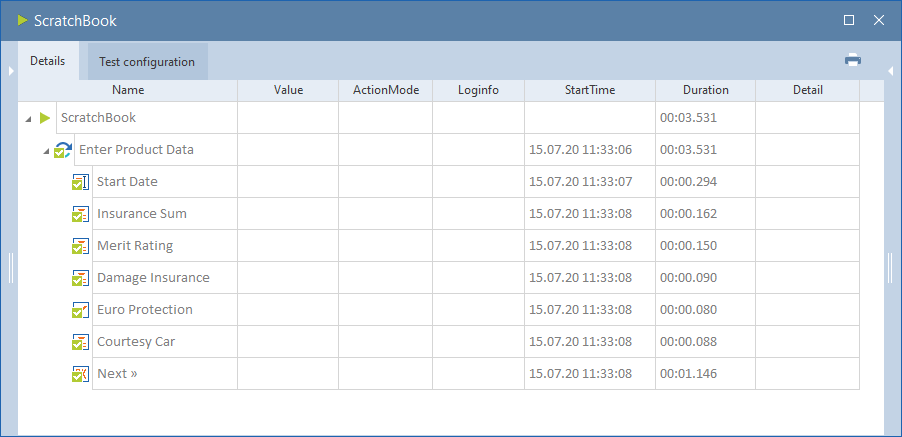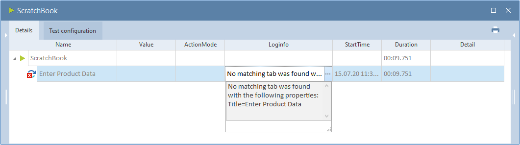 Sobald der Testlauf abgeschlossen ist, öffnet sich das ScratchBook-Fenster und zeigt das Ergebnis an. Erweitern Sie Enter Product Data, um das Ergebnis aller Testschrittwerte anzuzeigen.