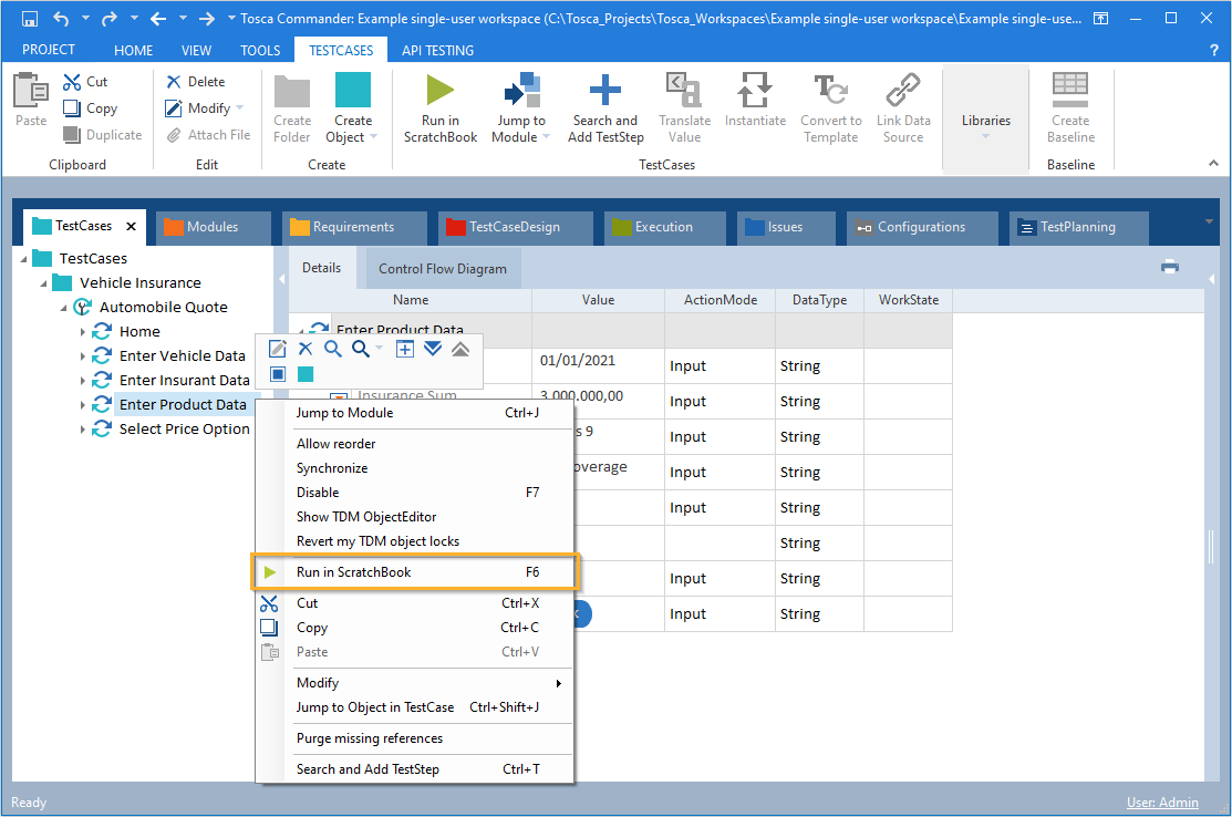 Alternativ können Sie den Testschritt Enter Product Data auswählen und F6 drücken oder im Menü TestCases auf Run in ScratchBook klicken. Für weitere Informationen zu Menübändern und Kontextmenüs siehe Kapitel "Menüs des Tosca Commander".