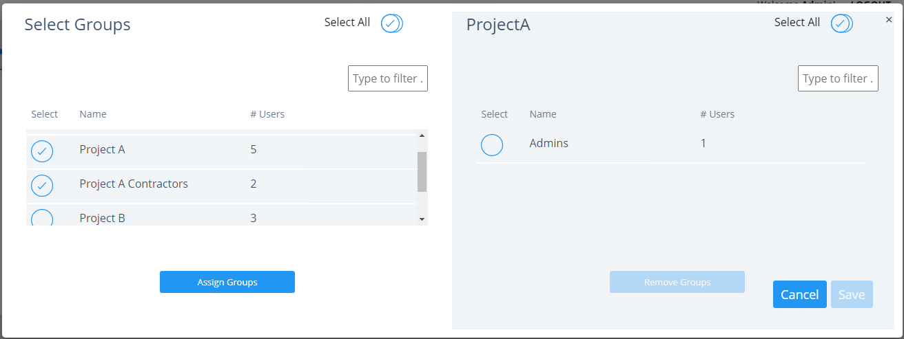 2. Wählen Sie im Folgedialog die Gruppe(n) aus, die Sie dem Projekt zuweisen möchten, und klicken Sie auf Assign Groups.