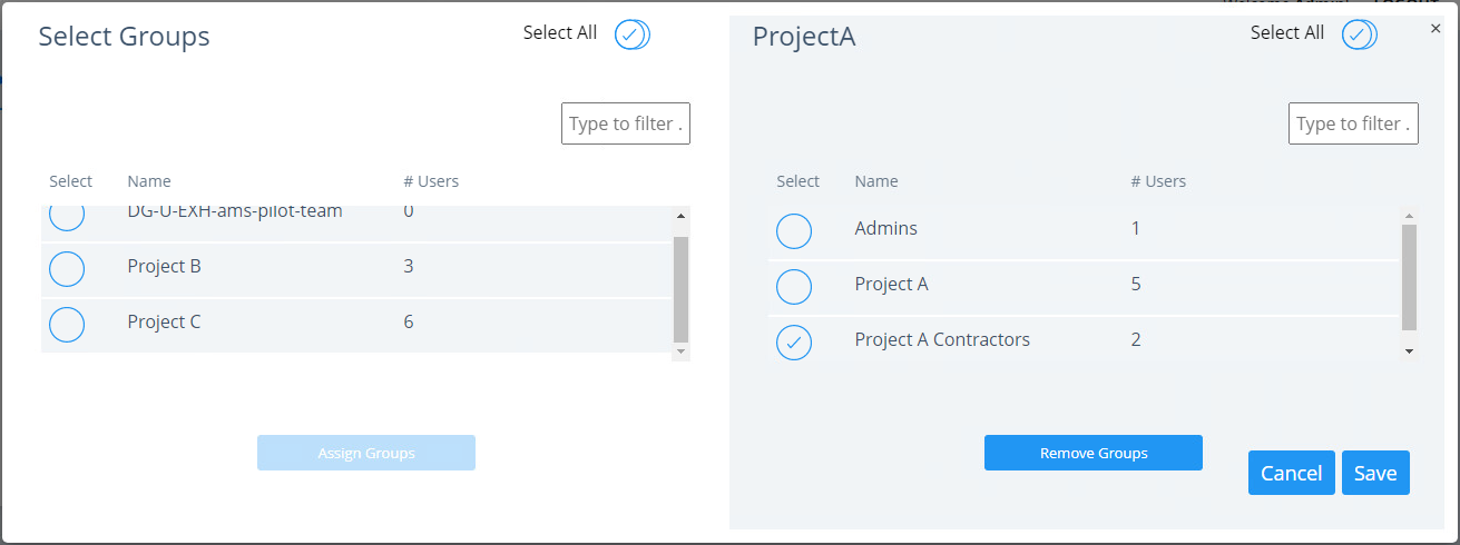 Benutzergruppen Project A und Project A Contractors einem Projekt zuweisen