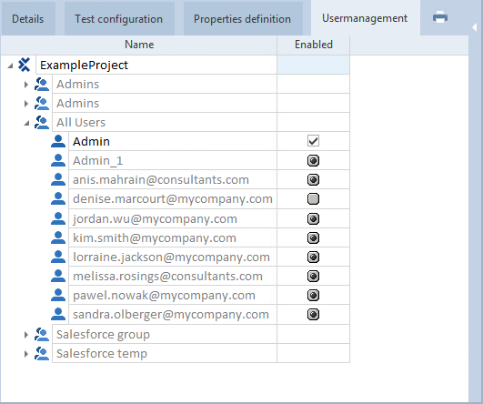 Wie bei der Benutzerverwaltung des Tosca Commander können Sie keine Benutzer aus einem Projekt löschen. Tosca unterstützt dies nicht, da es zu Dateninkonsistenzen in verschiedenen Versionen führt. Wenn Sie also eine Gruppe einem Projekt zuweisen, mit dem Tosca Commander synchronisieren und dann die Gruppe aus dem Projekt entfernen, sehen Sie immer noch diese Benutzer im Tosca Commander. Sie werden jedoch als deaktiviert angezeigt und haben keinen Zugriff auf das Projekt.
