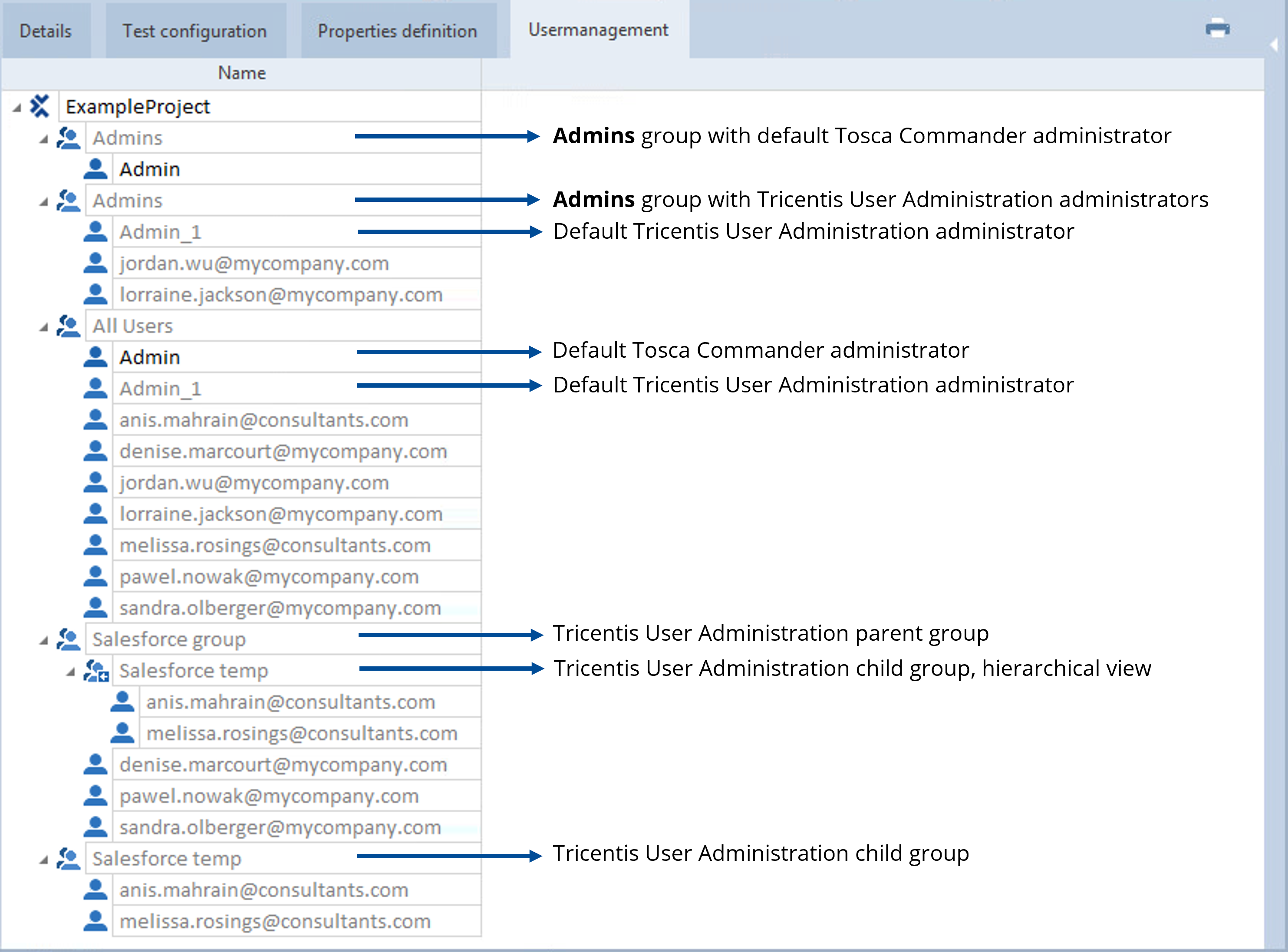 • Eine separate Tosca Commander-Benutzergruppe für jede Benutzergruppe der Tricentis User Administration, die diesem Projekt zugewiesen ist, einschließlich Untergruppen. Der Tosca Commander listet außerdem Untergruppen hierarchisch unter ihren übergeordneten Gruppen auf. Dadurch können Sie Untergruppen die Rechte ihrer übergeordneten Gruppen übernehmen lassen oder verschiedene Rechte für sie definieren.