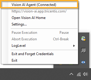 Der Vision AI Agent speichert Ihre Anmeldedaten, bis Sie über das Taskleistensymbol Exit and Forget Credentials auswählen. |