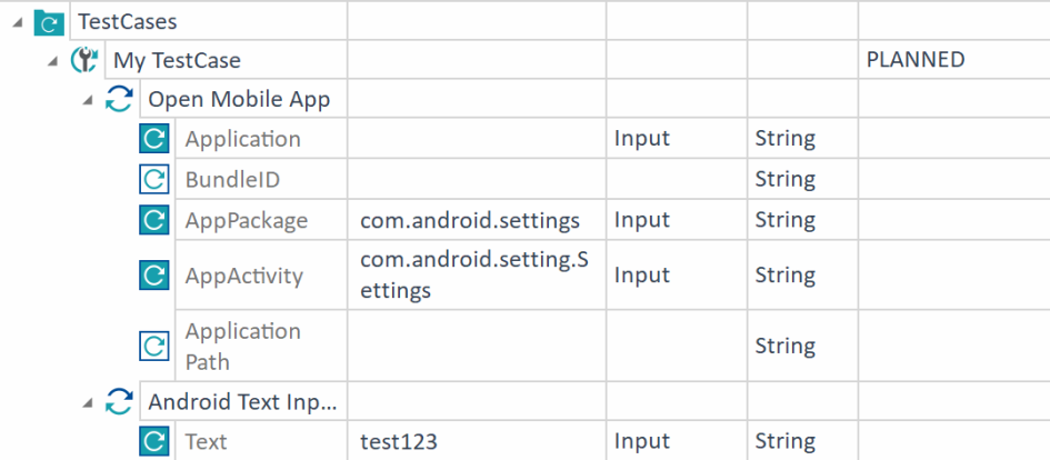 In this example, you use the Android Text Input (KeyEvents) Module in a TestCase called My TestCase. This TestCase sends the text test123 to the focused input field as Android key events.