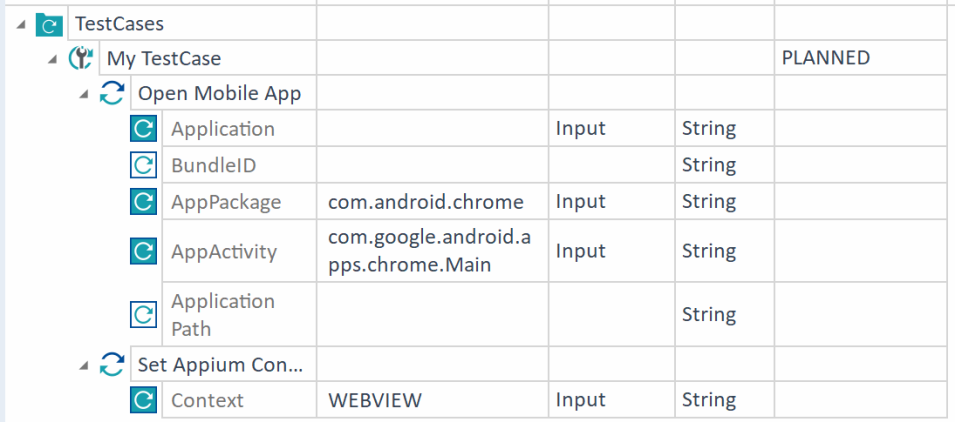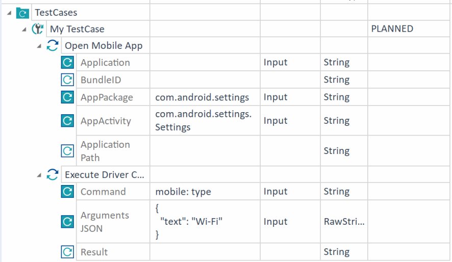 In this example, you open the mobile application with the Open Mobile App Module by specifying the PackageName and the Activity of the application you want to steer.