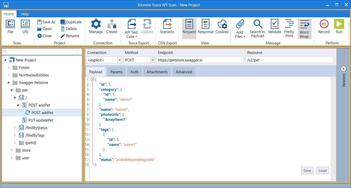 The Tricentis Tosca API Scan interface consists of the following sections: