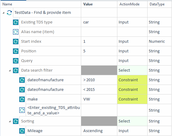 In the TestStep TestData - Find & provide item, enter car as the Existing TDS type. If you leave the Alias name (item) XTestStepValue blank, Tricentis Tosca uses the Value of Existing TDS type.