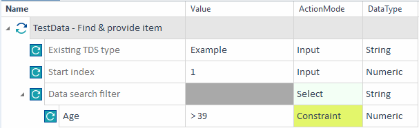 Drag the Module TestData - Find & provide item onto the Example TestCase to create a new TestStep. Add the Age XTestStepValue under Data search filter, add the value, set the ActionMode to Constraint, and set the DataType to Numeric.