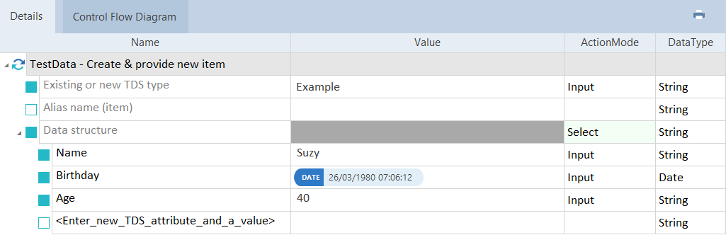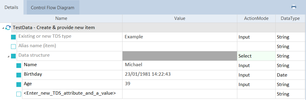 In the TestStep TestData - Create & provide new item under the Example TestCase, check the values of Data structure.