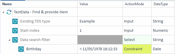 Drag the Module TestData - Find & provide item onto the Example TestCase to create a new TestStep. Add the Birthday XTestStepValue under Data search filter, add the value, set the ActionMode to Constraint, and set the DataType to Date.
