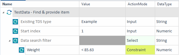 Add the Weight XTestStepValue under Data search filter, set the ActionMode to Constraint, and set the DataType to Numeric.