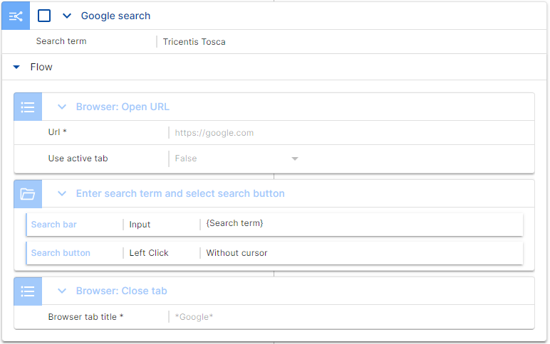 You also have a parameter called Search term for this reusable test step. This parameter defines what Tosca Cloud enters into the search bar. The parameter has a default value: Tricentis Tosca.