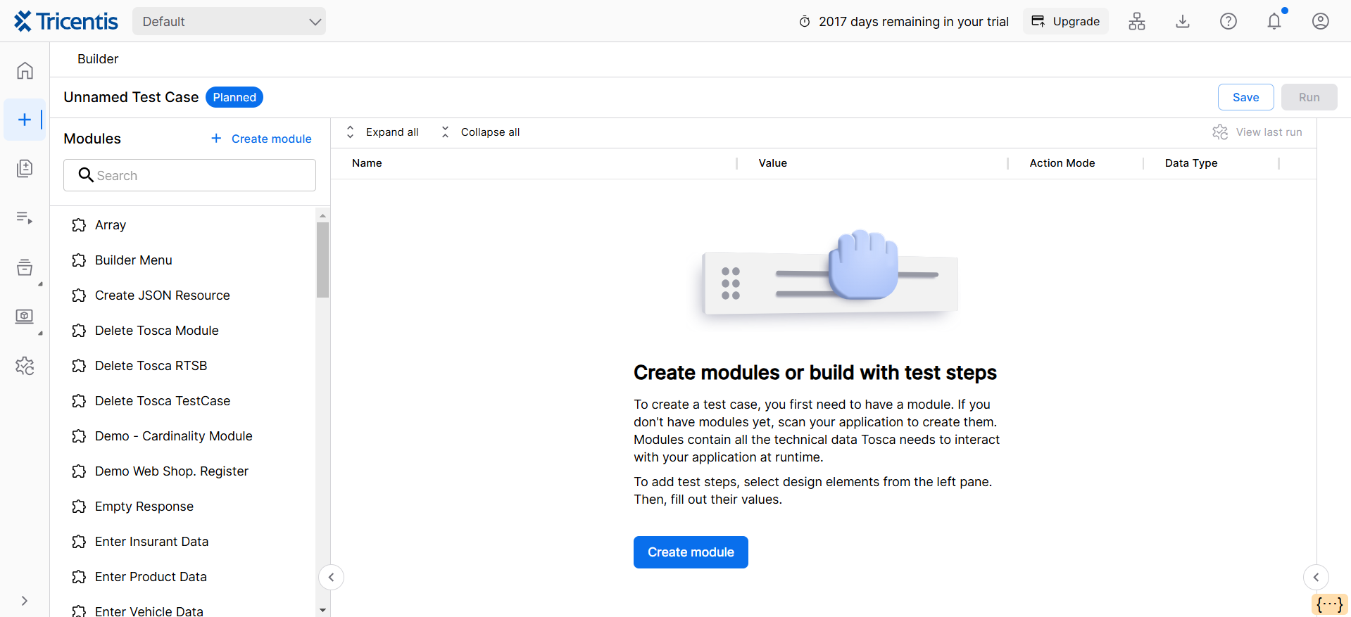 You can use modules you created by scanning, or you can use standard modules. Standard modules are pre-built modules for common tasks that Tosca Cloud provides out of the box.