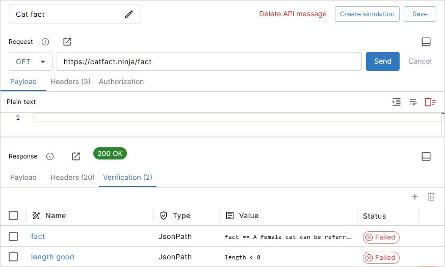 Verifications help you test whether your service works as expected. You can verify message format, content, or response codes. Just set the values you expect and compare them to what the service actually returns.