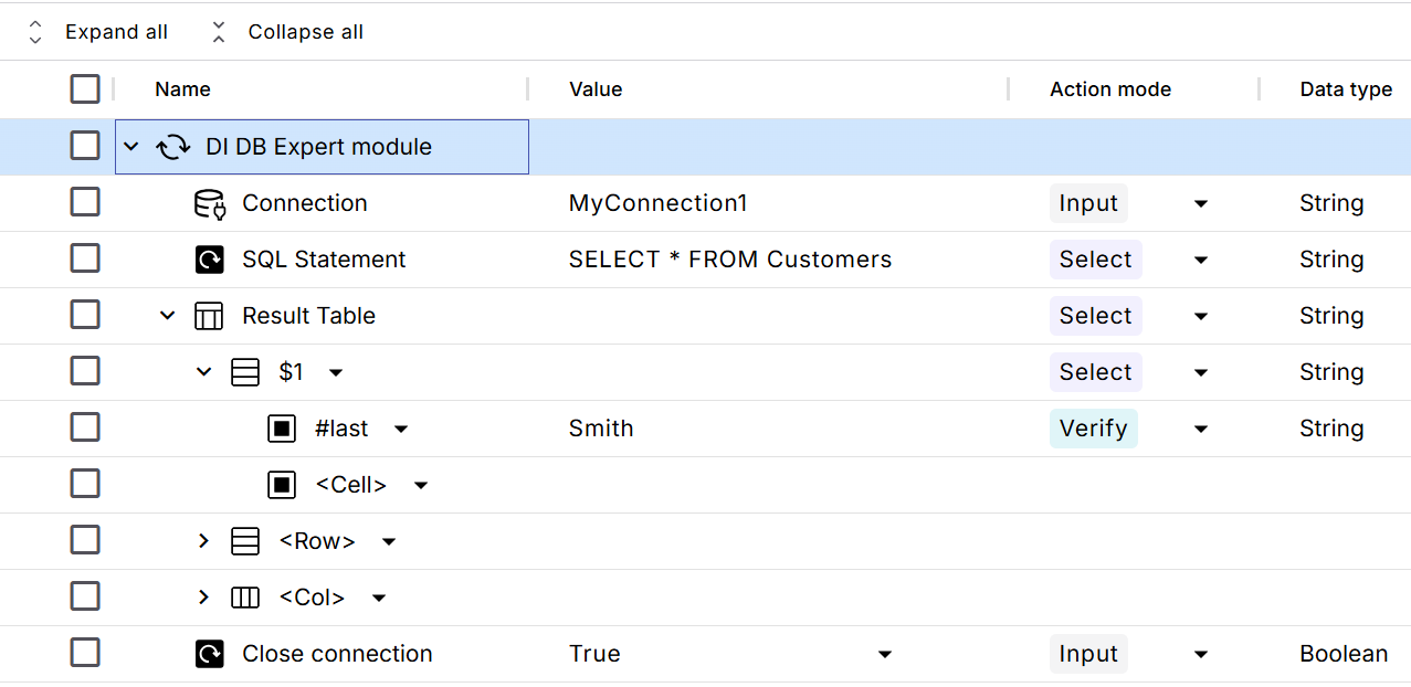 Verify or buffer values from the result of your SQL statement. For more information on table steering, see chapter "Table". If needed, you can buffer or verify the table property RowsAffected. This property indicates how many rows the specified SQL statement affected. If the statement didn't affect any rows, the value is 0. For SELECT statements, the value is -1. Alternatively, if you want to export the result of your SQL statement into a comma-separated CSV file, enter {EXPORTTOCSV[<absolute path to the CSV file>]} as the value of Result Table. Note that when you run your test Tosca Cloud creates a file if one doesn't already exist. If a file with the same name already exists under this path, Tosca Cloud overwrites the existing file. |