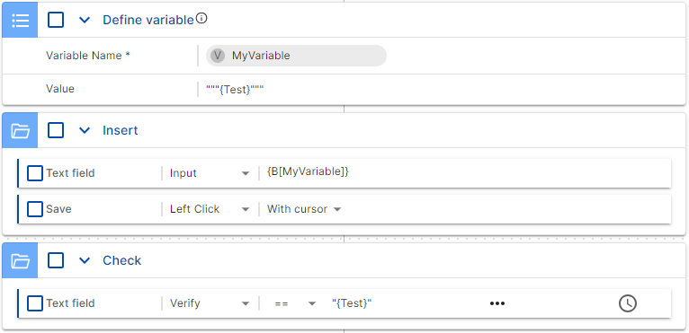 The Check test step verifies whether the content of the text field is now {Test}. The value contains { and }, so you need to escape them. However, because this step doesn't use the standard test step Define variable, the base rule for escaping applies.