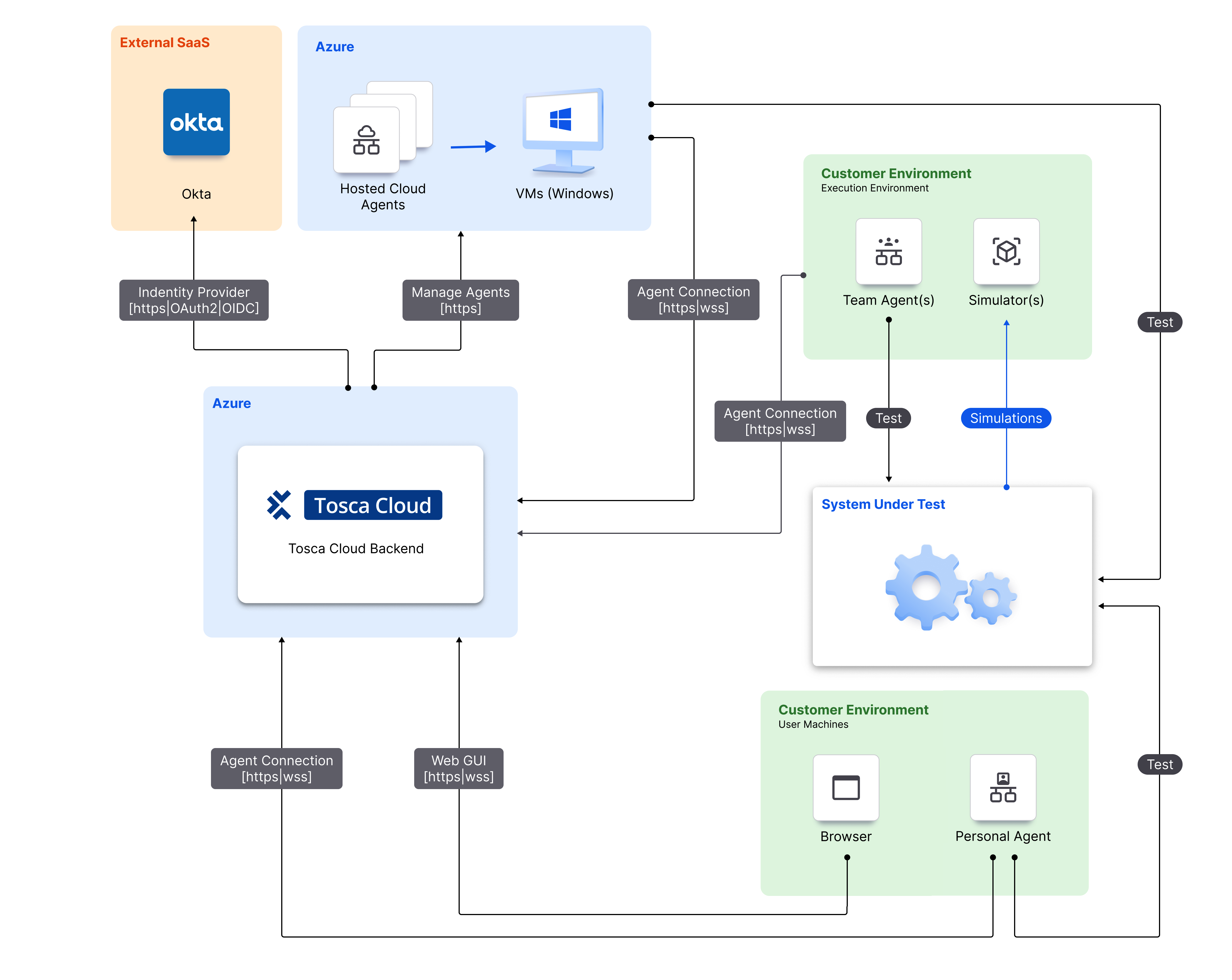 自社のネットワーク内からブラウザを通じて、Tosca Cloudにアクセスします。会社のファイアウォールとプロキシがアクセスを許可している限り、Tosca Cloudのために、それ以外何もする必要はありません。The communication between チーム agents and the web application happens via WebSocket, with an HTTPS binding.