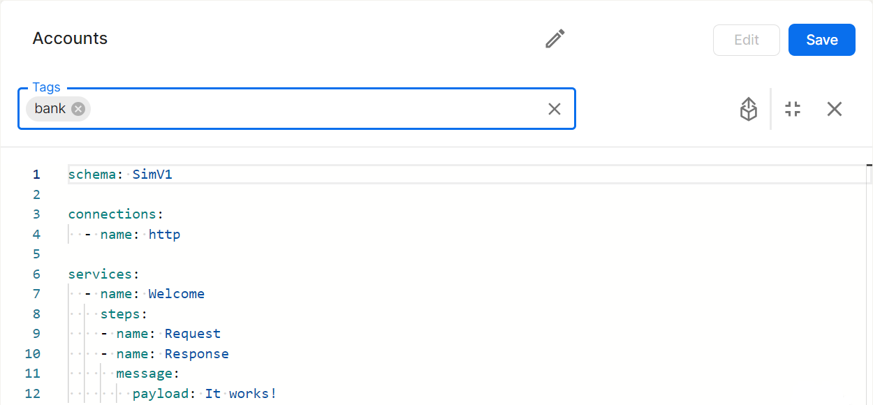 シミュレーションの内容を定義します。エディタには、自動補完や値の提案、さらにエラーアラートが含まれます。