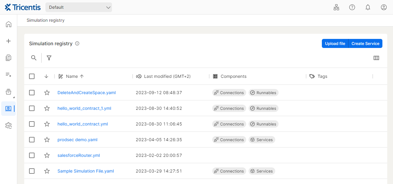 シミュレーションレジストリページには、Tosca Cloudにホストされているすべてのシミュレーションファイルが一覧表示されます。You can deploy these files to your シミュレータAgent to run simulations.